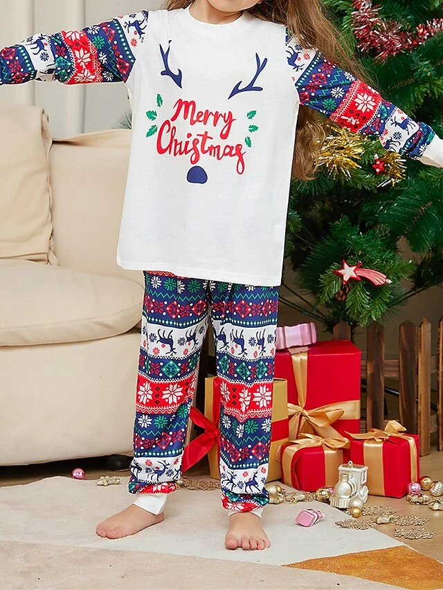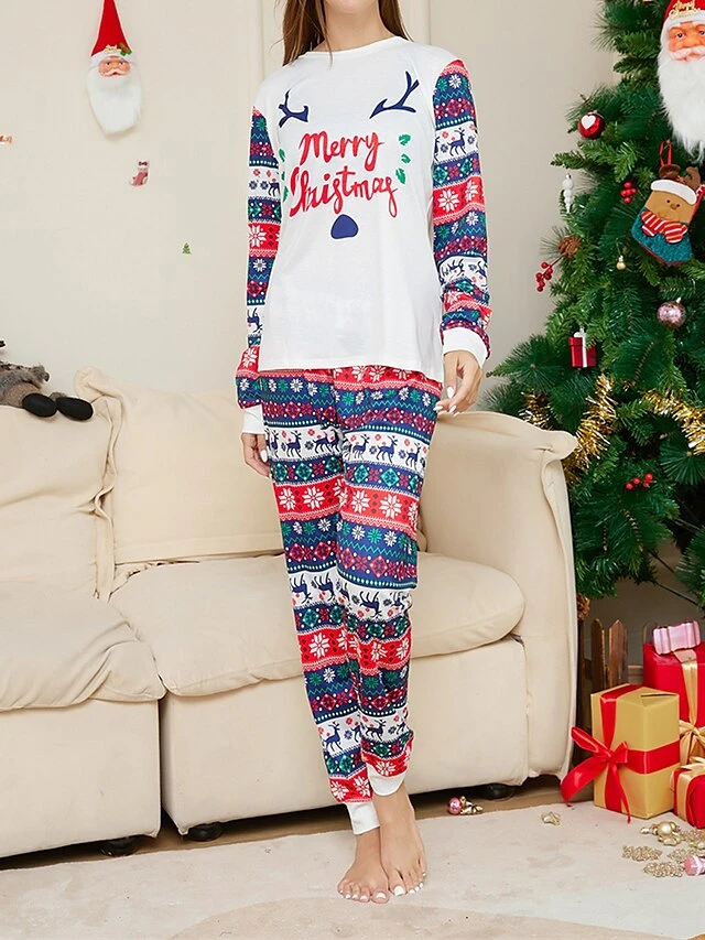Matching Family Christmas Pajamas Sets Letter Elk Basic Casual Comfort Home Christmas Cotton Breathable Gift Crew Neck Long Sleeve T Shirt Tee Pant Fall Winter White