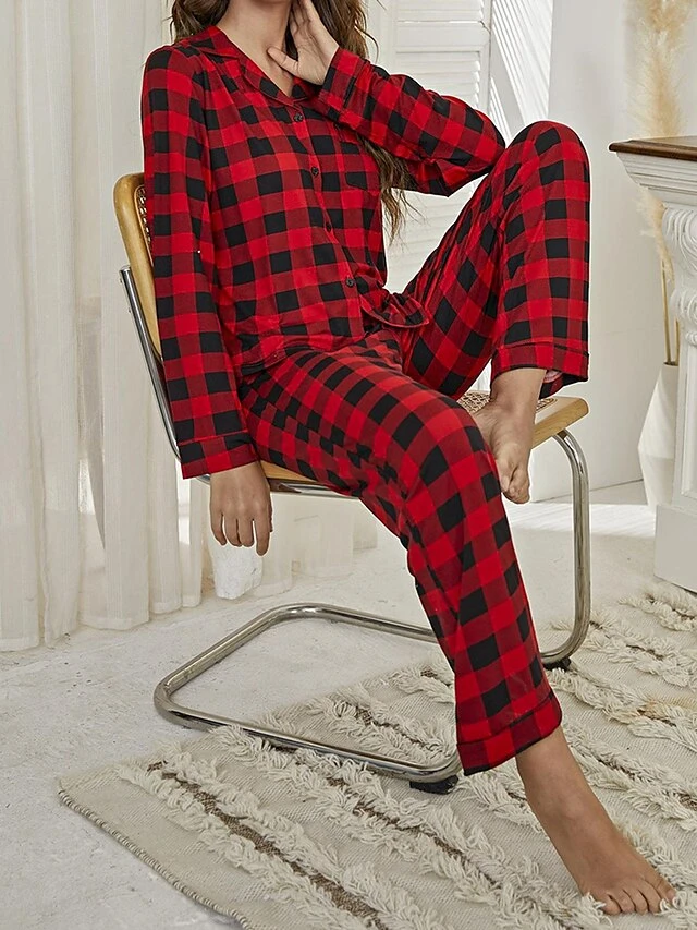 Women’s Christmas Pajamas Sets Grid / Plaid Casual Comfort Soft Home Xmas Daily Bed Polyester Breathable Lapel Long Sleeve Shirt Pant Elastic Waist Fall Winter Red