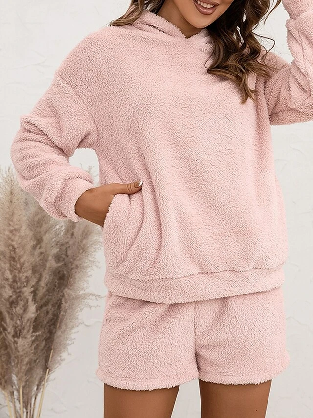 Women’s Coral Fleece Lounge Sets Pure Color Casual Comfort Soft Street Daily Vacation Coral Velvet Breathable Hoodie Long Sleeve Shorts Elastic Waist Fall Winter Pink Navy Blue