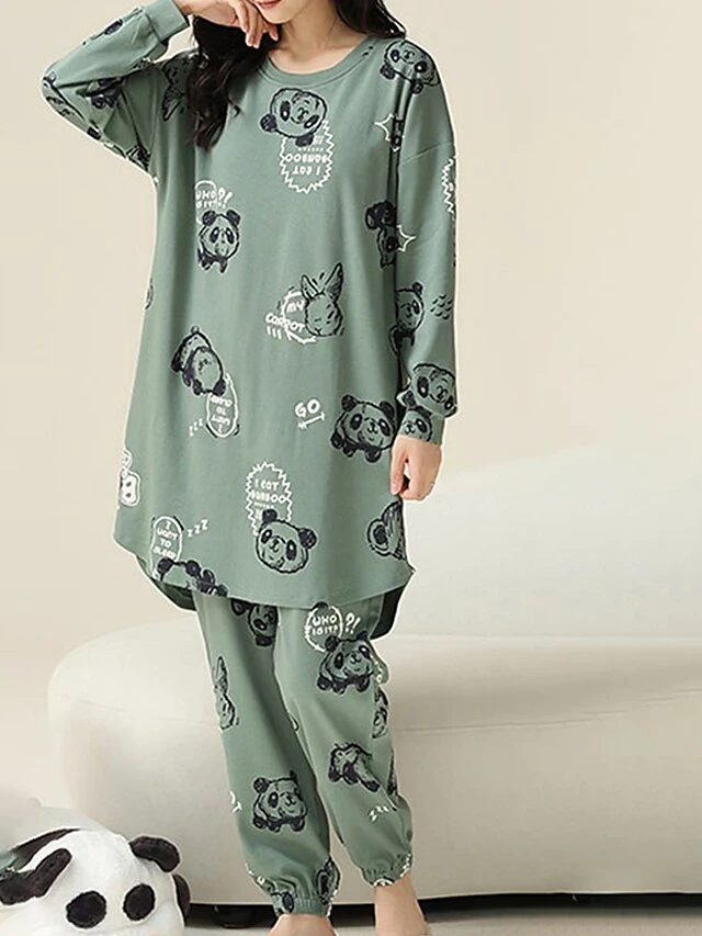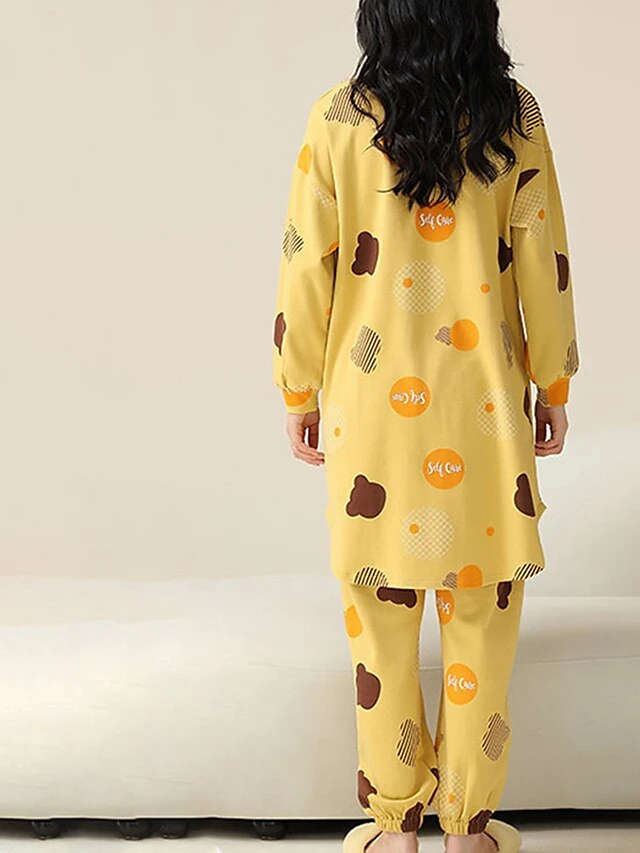 Women’s Cotton Pajamas Sets Letter Panda Casual Comfort Home Bed Breathable Crew Neck Long Sleeve Pullover Pant Pocket Fall Winter White Yellow