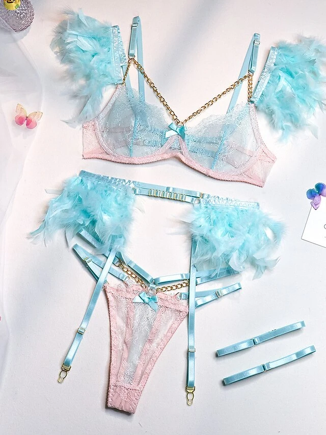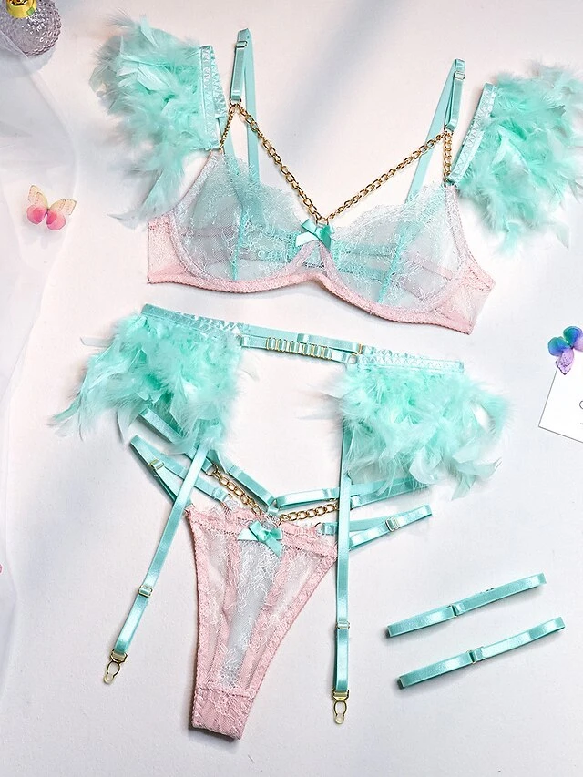 Women’s Feather Sexy Lingerie Sets 4 Pieces Pure Color Lovers Hot Home Bed Date Lace Breathable Straps Sleeveless Backless Feather Summer Spring Light Pink White Powder
