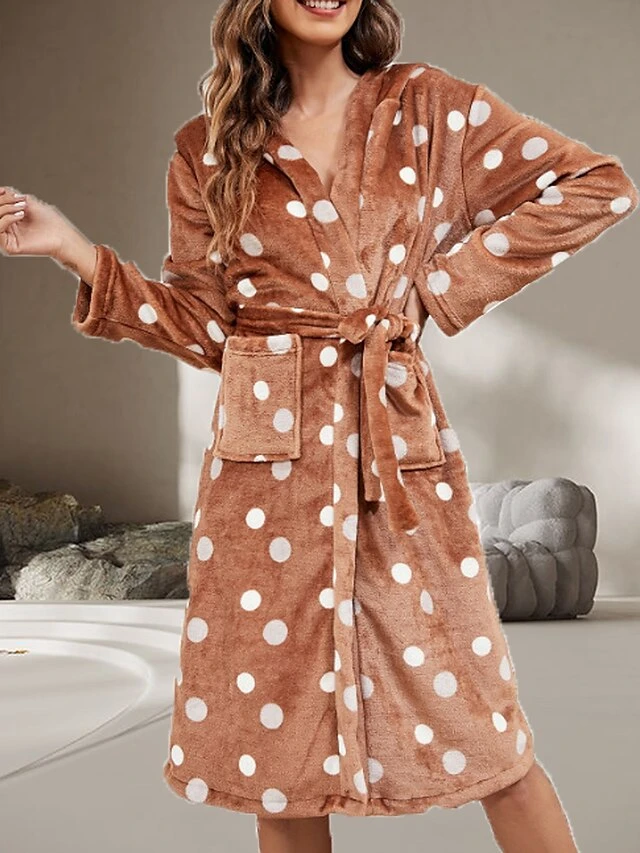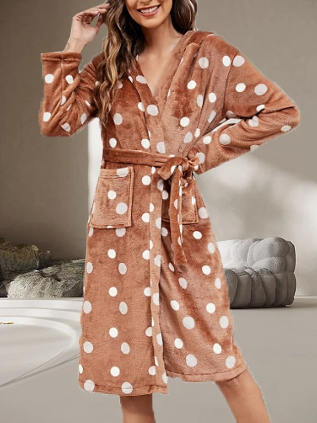 Women’s Flannel Bathrobe Robes Gown Dot Simple Casual Comfort Home Daily Bed Breathable V Wire Long Sleeve Pocket Fall Winter Brown