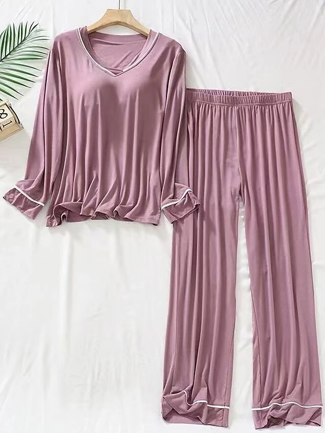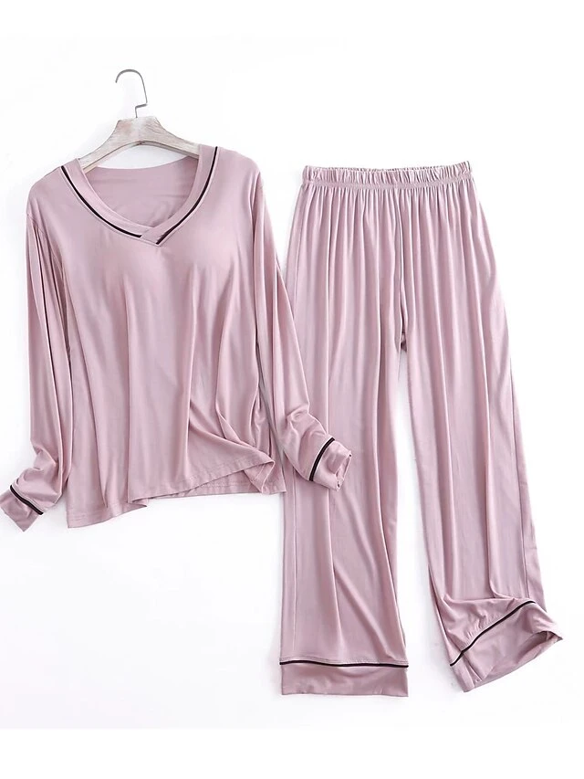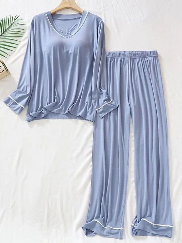 Women’s Light Blue Pajamas Sets With Chest Pads Pure Color Simple Casual Comfort Home Daily Bed Modal Breathable Crew Neck Long Sleeve Chest Pads Fall Winter Lotus Pink Pink