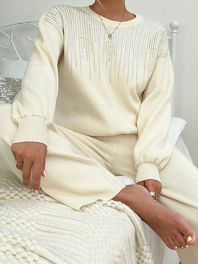 Women’s Lounge Sets Pure Color Fashion Comfort Soft Home Daily Going Out Rayon Breathable Crew Neck Long Sleeve Sweater Pant Fall Winter Beige