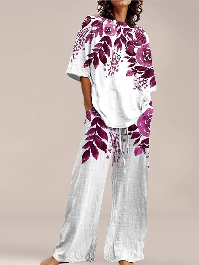 Women’s Lounge Sets Top And Pant Flower Comfort Home Daily Polyester Crew Neck Summer Spring Pink Blue