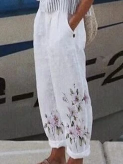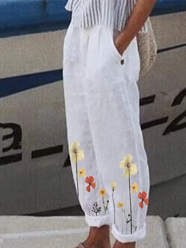 Women’s Loungewear Bottom Nighty Flower Simple Comfort Home Street Cotton And Linen Long Pant Elastic Waist Spring Summer Purple Yellow