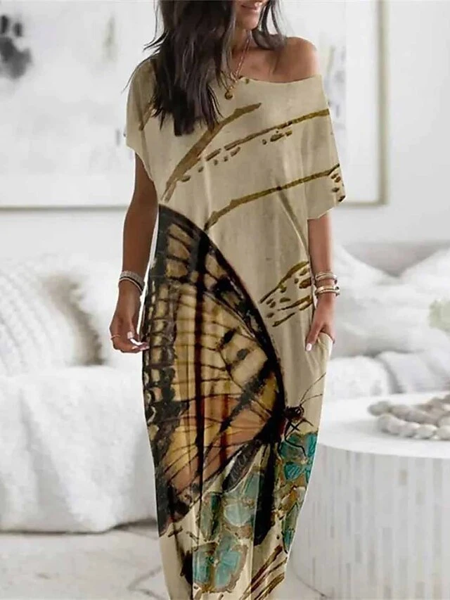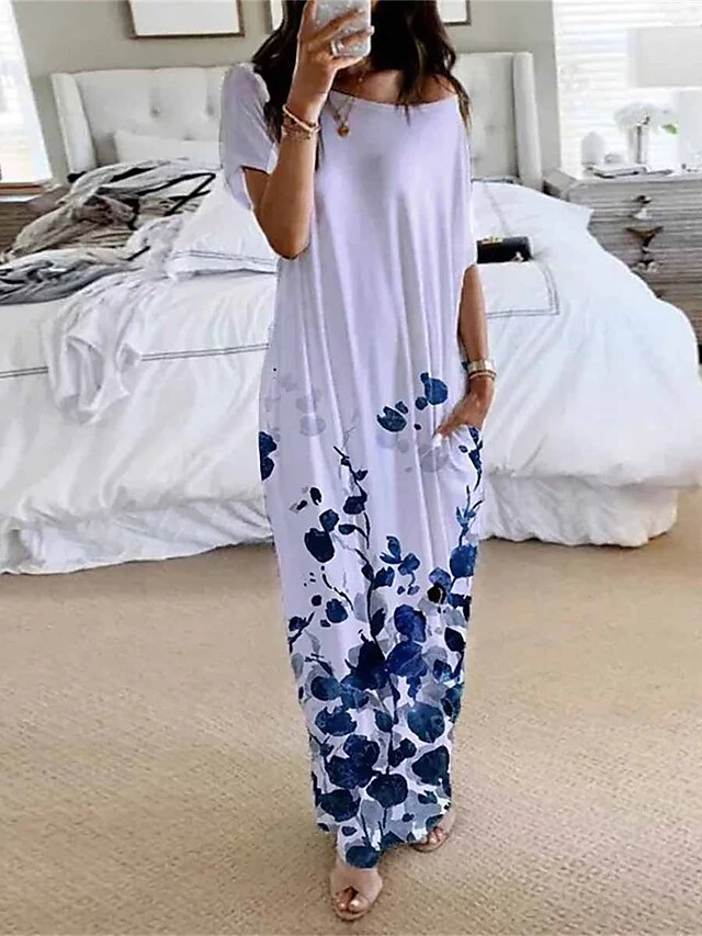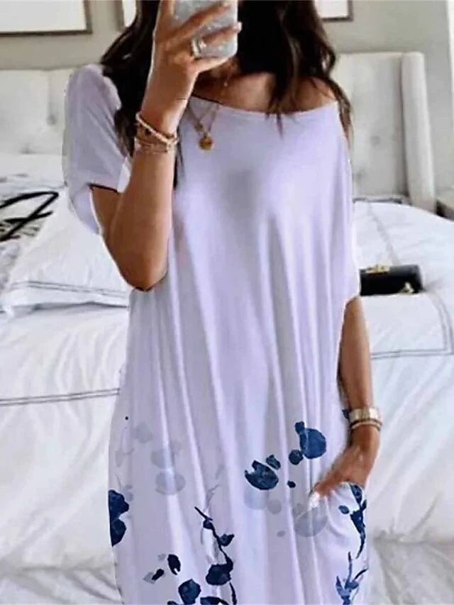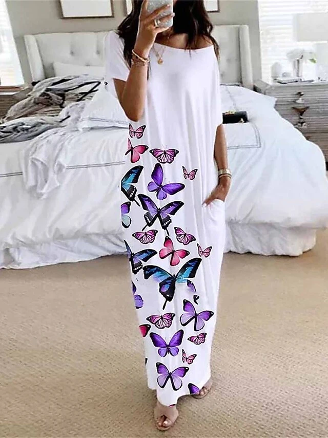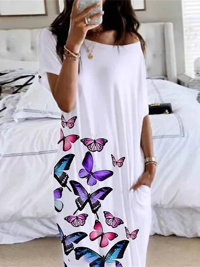 Women’s Loungewear Nightshirt Dress Butterfly Flower Fashion Casual Comfort Home Daily Bed Polyester Breathable Crew Neck Short Sleeve Dress Pocket Summer Spring White Red