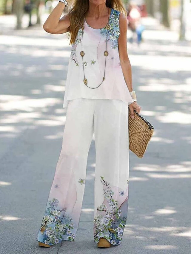 Women’s Loungewear Sets 2 Pieces Flower Leaves Casual Comfort Street Daily Polyester Breathable Crew Neck Sleeveless Pullover Pant Summer Spring White Pink