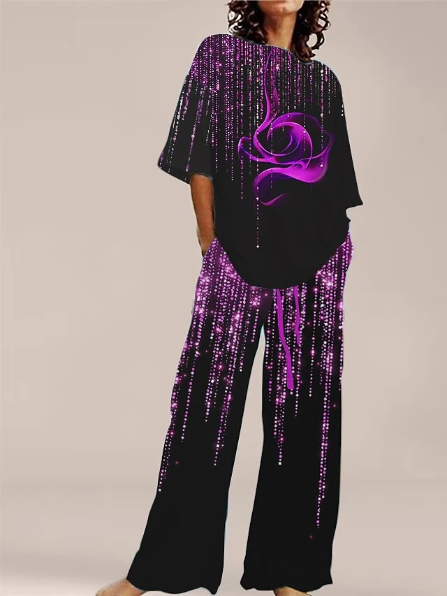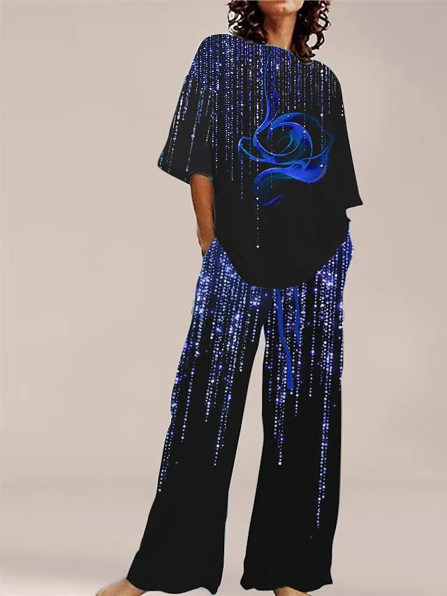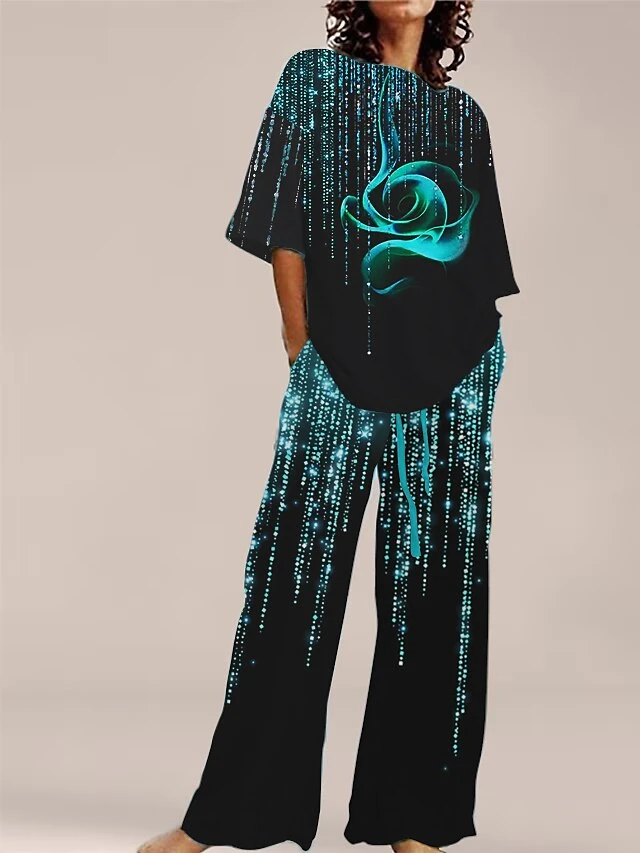 Women’s Loungewear Sets 2 Pieces Flower Simple Comfort Sweet Home Daily Polyester Breathable Crew Neck Short Sleeve Pullover Pant Pocket Summer Spring Light Pink Lake Blue