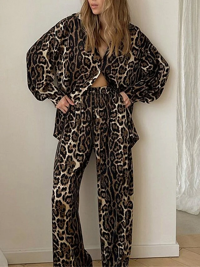 Women’s Loungewear Sets 2 Pieces Leopard Maillard Fashion Casual Comfort Street Daily Date Polyester Breathable Lapel Long Sleeve Pant Button Fall Winter Black