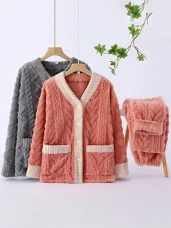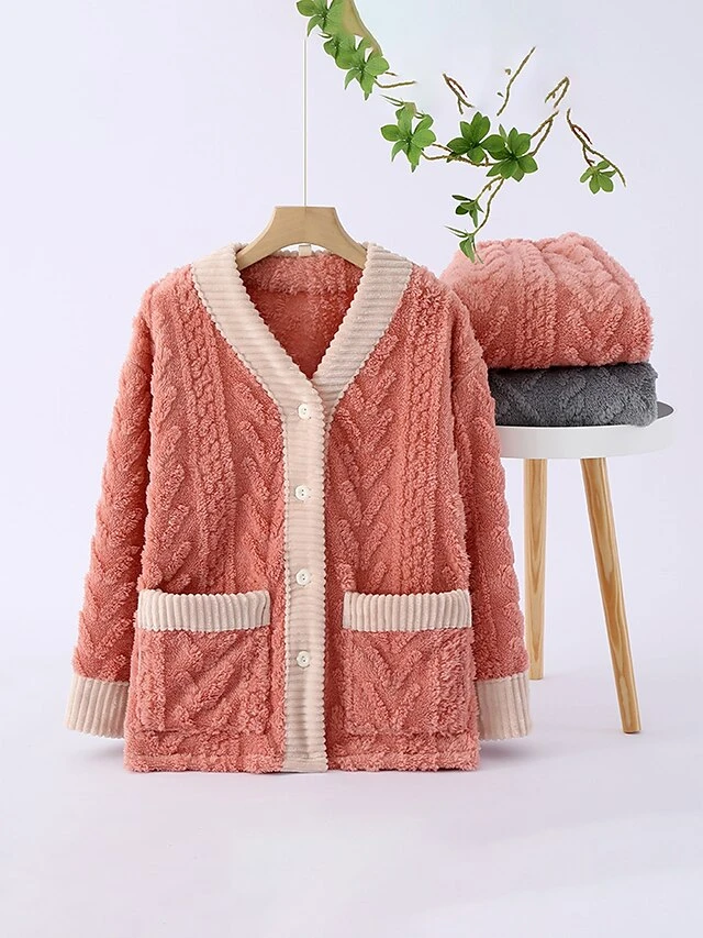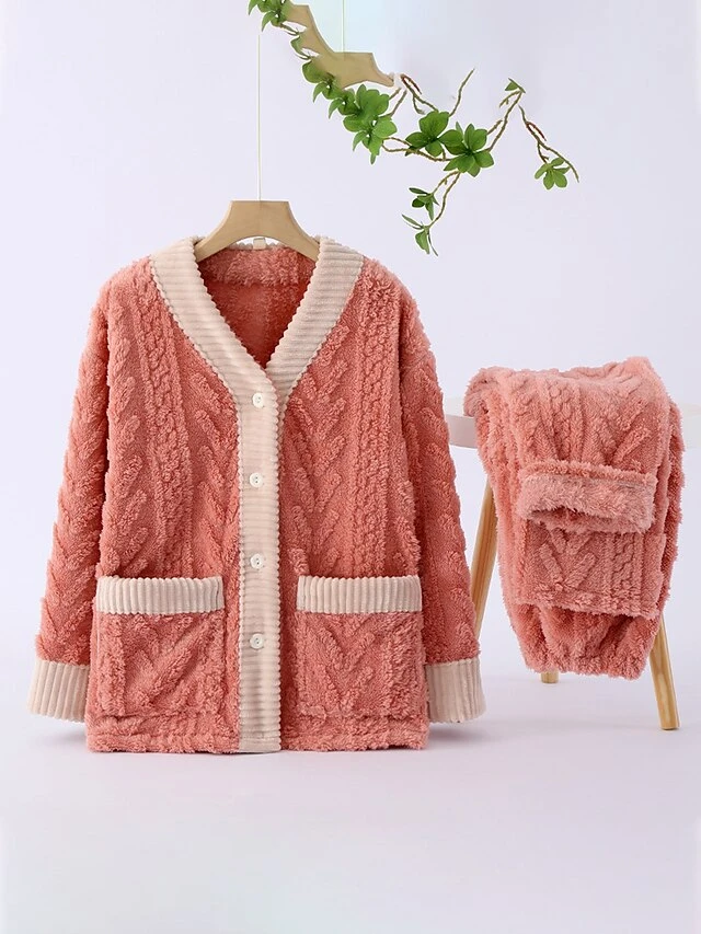Women’s Loungewear Sets 2 Pieces Pure Color Warm Fashion Simple Home Jacquard Fleece Comfort Warm V Wire Pant Button Pocket Fall Winter V-neck Dark Gray V-neck Orange Pink
