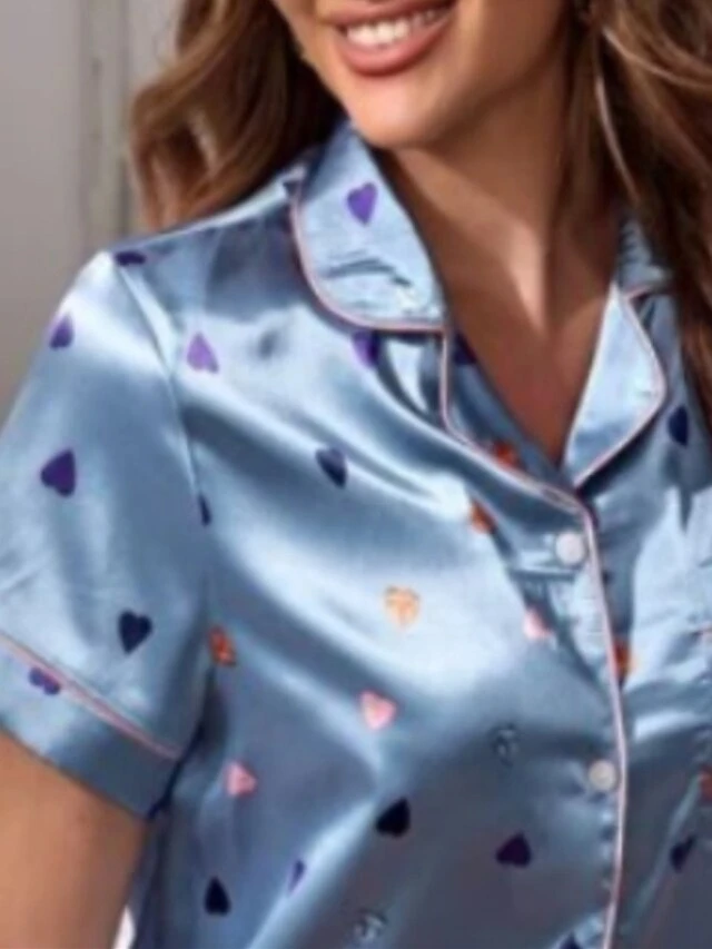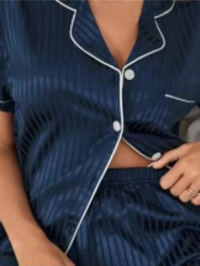 Women’s Loungewear Sets Heart Stripe Casual Comfort Soft Home Daily Bed Polyester Breathable Lapel Short Sleeve Shirt Shorts Pocket Elastic Waist Summer Spring Blue And White White