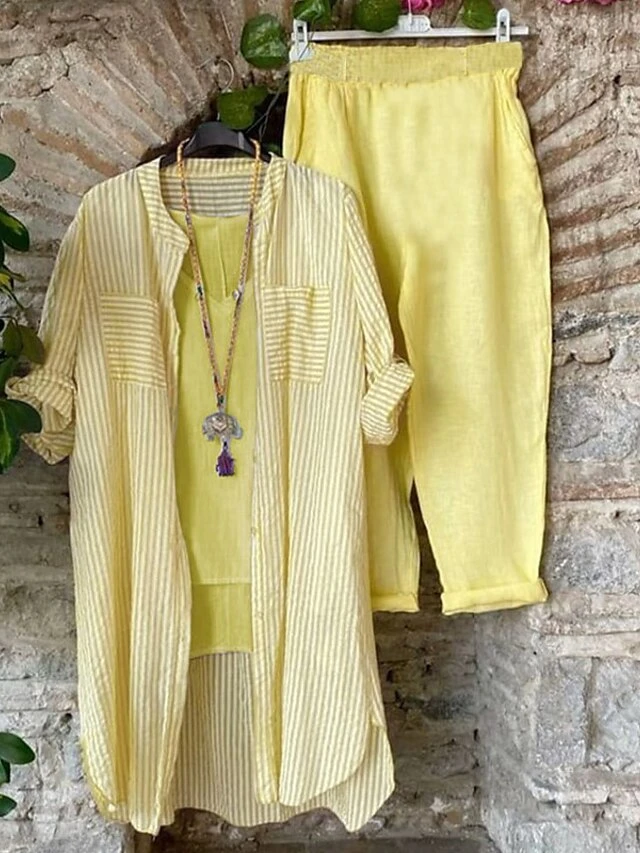 Women’s Loungewear Sets Nighty 2 Pieces Stripe Fashion Comfort Home Daily Polyester Lapel Long Sleeve Shirt Pant Button Without Belt Fall Spring Yellow