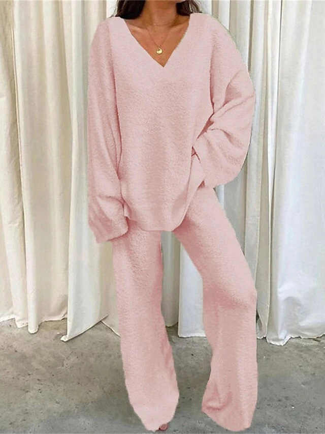 Women’s Loungewear Sets Pure Color Plush Casual Comfort Home Street Daily Sherpa Warm Breathable V Wire Long Sleeve Pant Fall Winter Black White