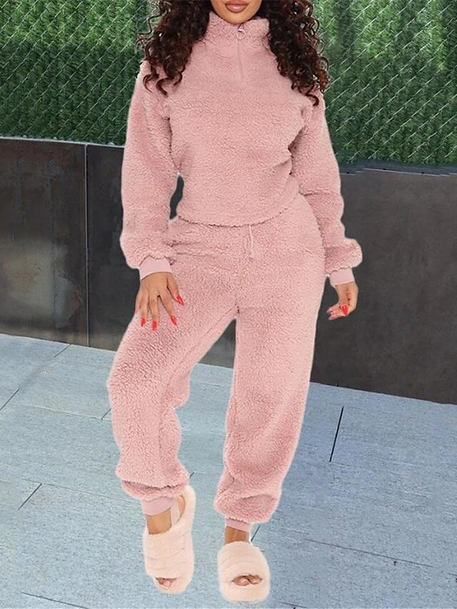 Women’s Loungewear Sets Pure Color Warm Fashion Comfort Daily Bed Coral Fleece Coral Velvet Warm Breathable Stand Collar Long Sleeve Pant Fall Winter Pink