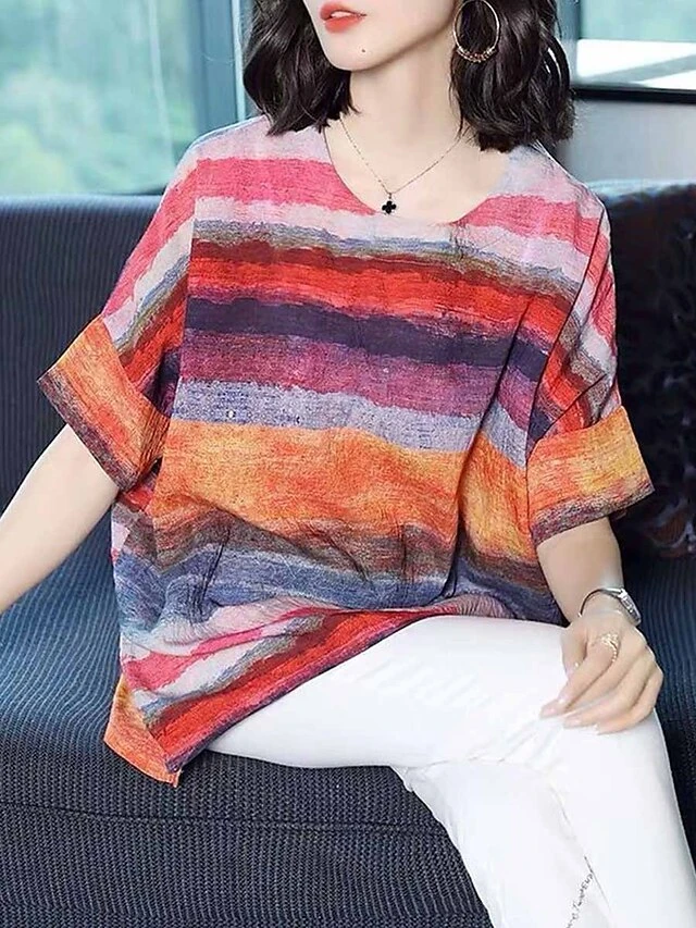 Women’s Loungewear Top Rainbow Stripe Fashion Casual Street Date Airport Polyester Breathable Crew Neck Half Sleeve Backless Summer Spring Rainbow