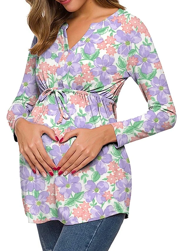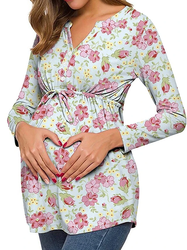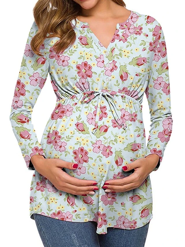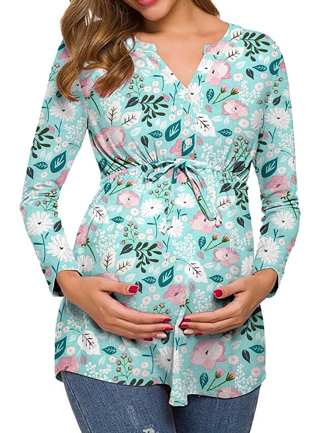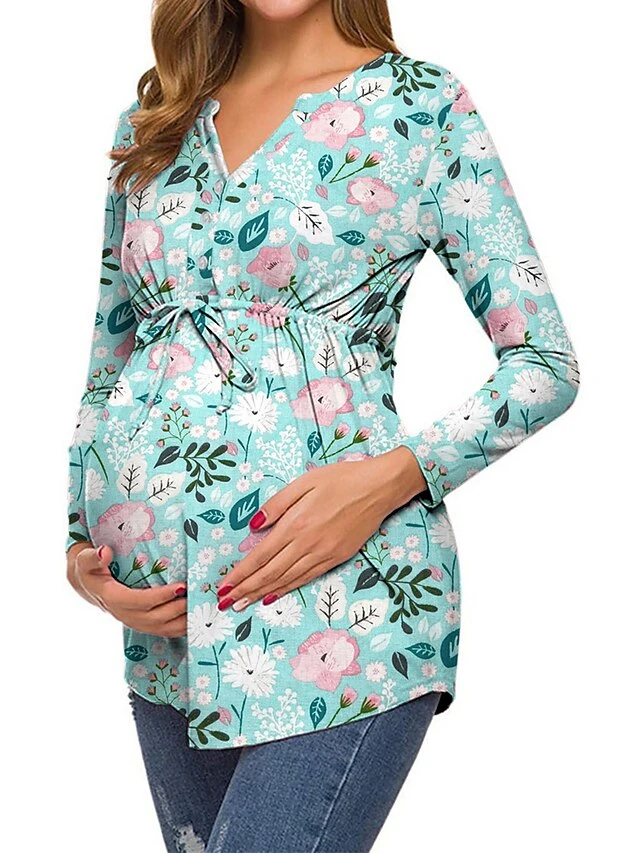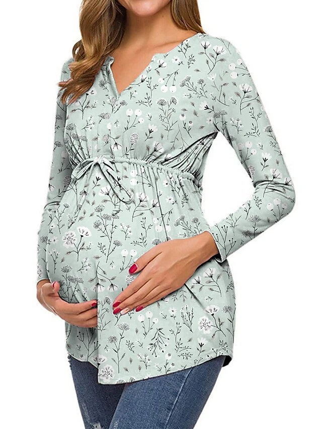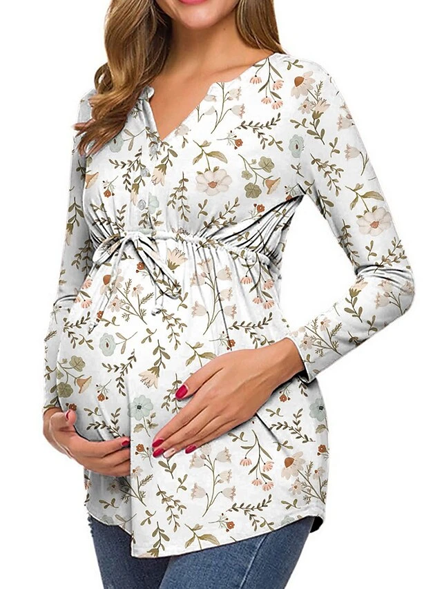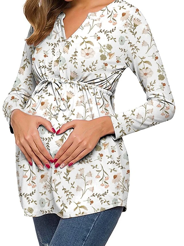 Women’s Maternity Tops Pregnancy Shirts Floral Pattern Casual Comfort Pastoral Home Daily Vacation Cotton Breathable V Wire Long Sleeve Fall Winter White Light Green