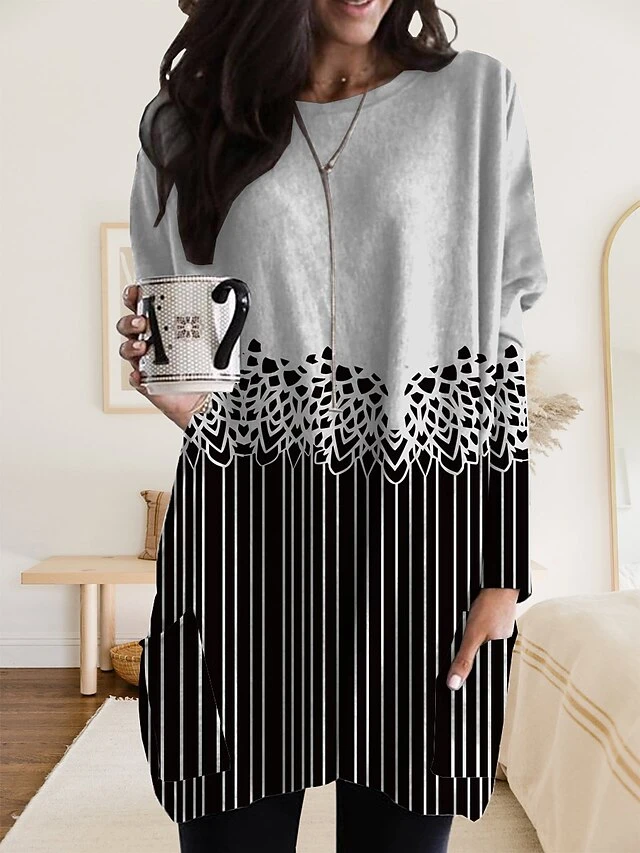 Women’s Nightgown Stripe Geometic Fashion Comfort Home Daily Polyester Crew Neck Long Sleeve Pocket Fall Winter Khaki Dark Blue