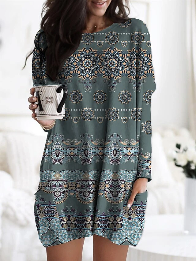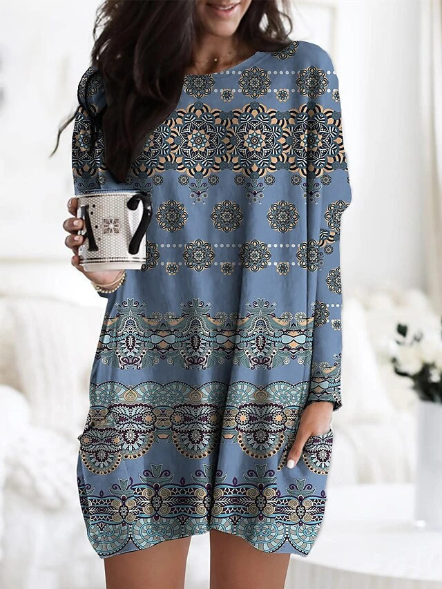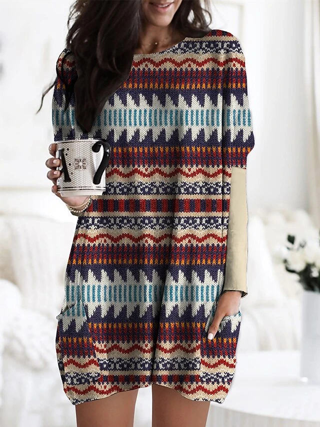 Women’s Nightgown Stripe Geometic Fashion Comfort Home Daily Polyester Crew Neck Long Sleeve Pocket Fall Winter Red Blue