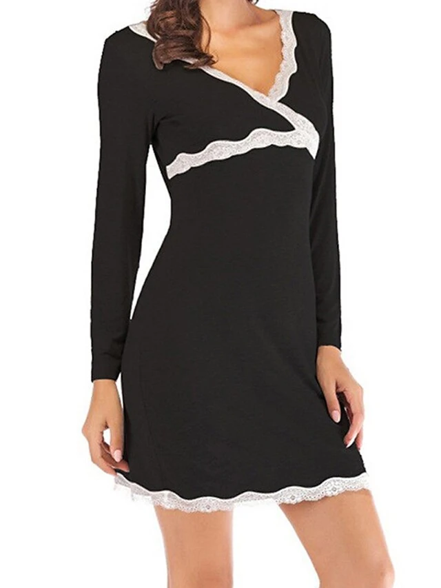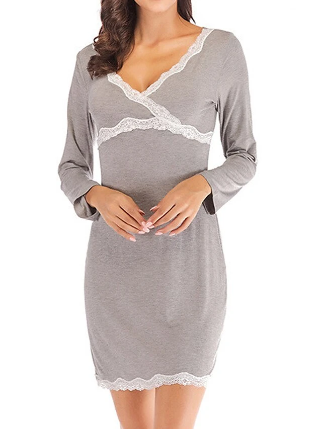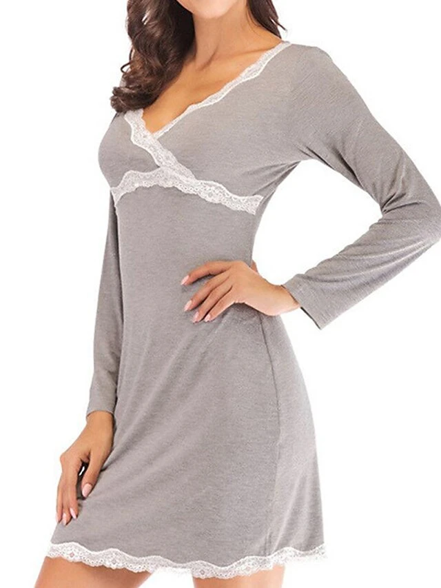 Women’s Pajamas Nightgown Nighty Pure Color Simple Comfort Home Daily Bed Modal Breathable Gift V Wire Long Sleeve Lace Basic Spring Summer Black Gray