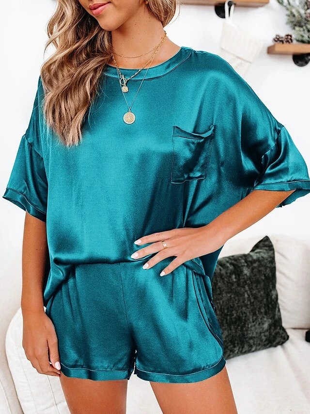 Women’s Pajamas Pajama Top And Pant Sets Pure Color Simple Casual Soft Home Daily Bed Satin Breathable Crew Neck Short Sleeve T Shirt Tee Shorts Summer Spring Lake Blue Black