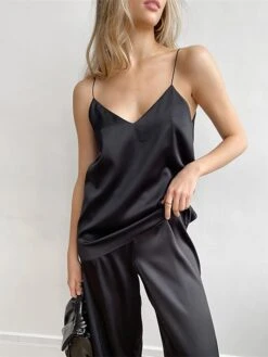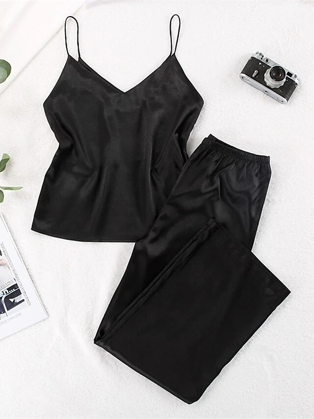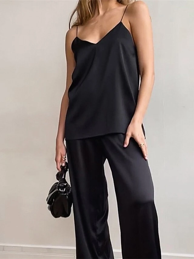 Women’s Pajamas Pajama Top And Pant Sets Pure Color Simple Casual Soft Home Daily Bed Satin Breathable Straps Sleeveless Strap Top Pant Spring Summer Black