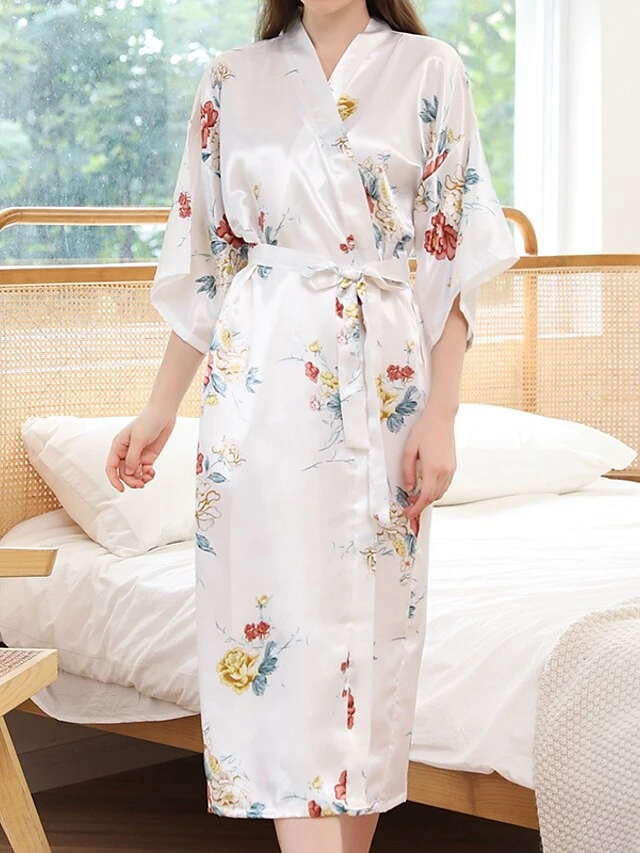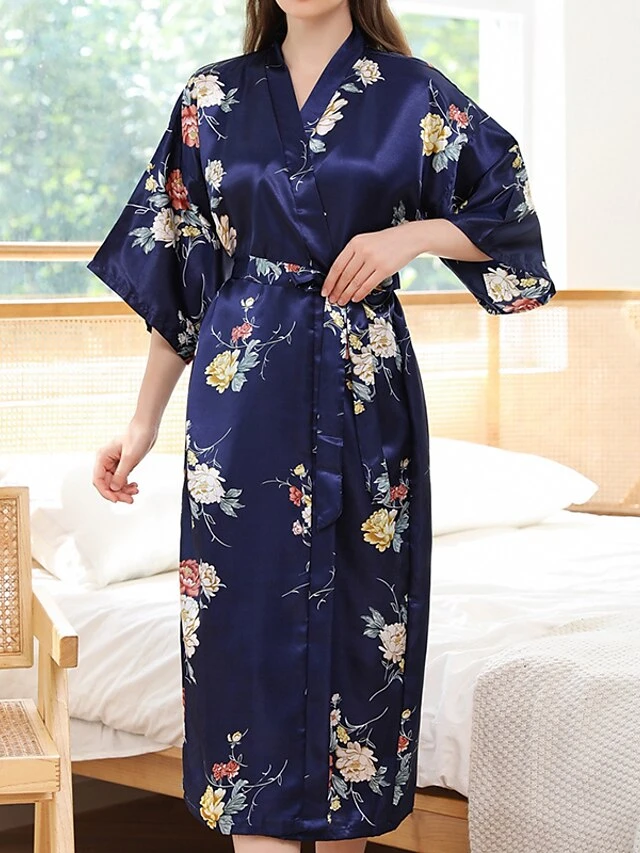 Women’s Pajamas Robes Gown Bathrobes Nighty 1 PCS Flower Simple Comfort Kimono Robes Home Wedding Party Spa Satin Gift Long Sleeve Print Belt Included Spring Summer Blue Pink