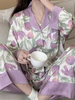 Women’s Pajamas Sets Flower Romantic Casual Comfort Home Bed Satin Breathable Lapel Long Sleeve Shirt Pant Button Pocket Fall Winter Purple