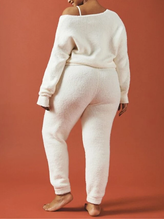 Women’s Pajamas Sets Pure Color Warm Fashion Casual Home Daily Bed Polyester Breathable Crew Neck Long Sleeve Pant Fall Winter White Pink