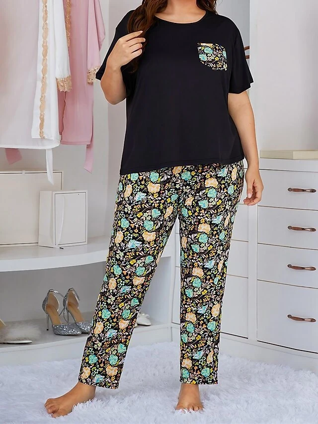 Women’s Plus Size Loungewear Sets Flower Fashion Comfort Soft Home Daily Bed Polyester Breathable V Wire Short Sleeve T Shirt Tee Pant Pocket Fall Winter NNS52M-Black