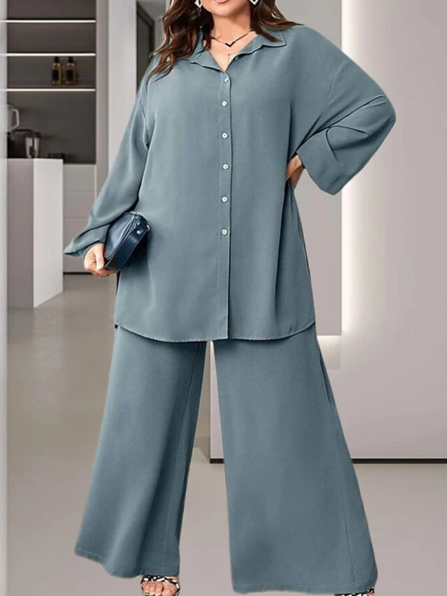 Women’s Plus Size Loungewear Sets Pure Color Fashion Comfort Soft Home Daily Bed Polyester Breathable Lapel Long Sleeve Shirt Pant Button Fall Winter Blue