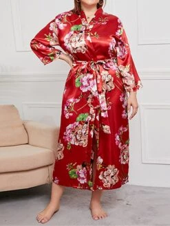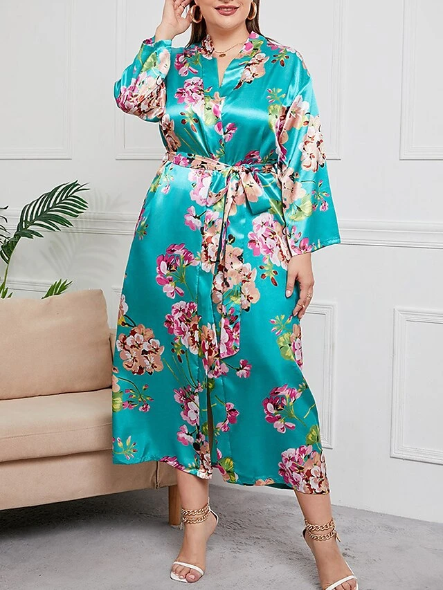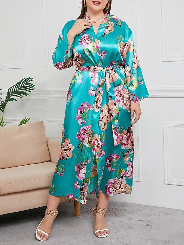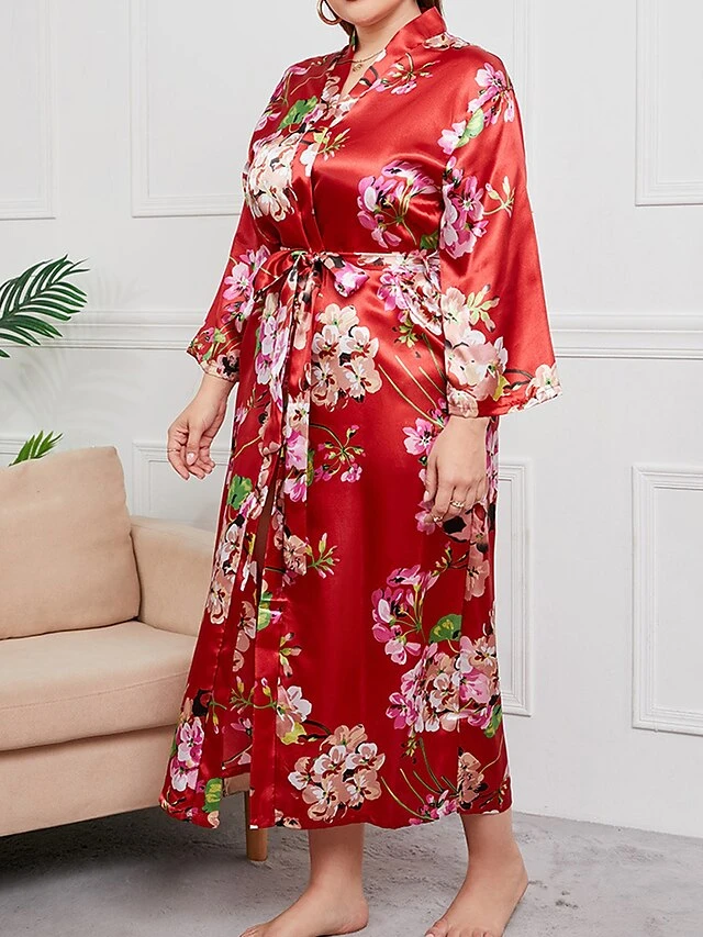 Women’s Plus Size Pajamas Bathrobe Flower Simple Casual Comfort Home Bed Satin Breathable V Wire Long Sleeve Summer Spring Red Green