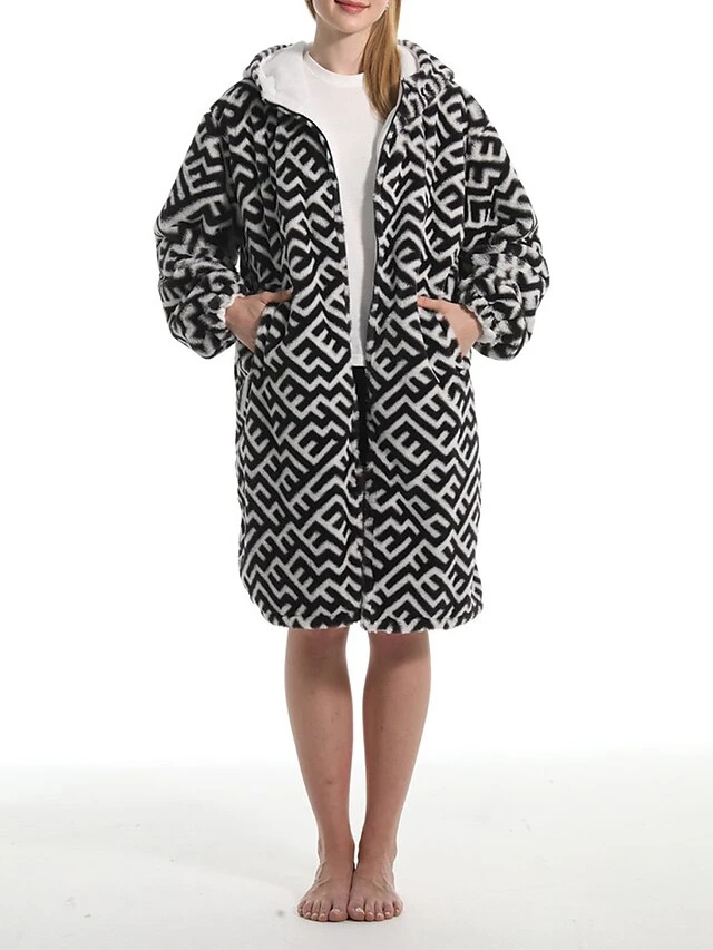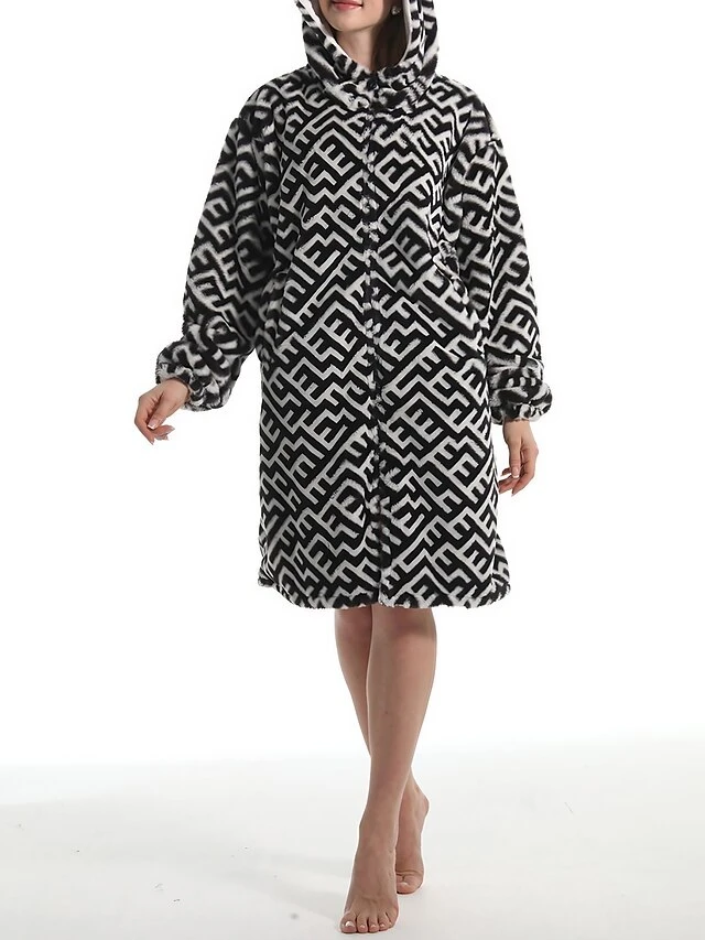 Women’s Robe Geometic Plush Casual Comfort Home Daily Bed Flannel Warm Breathable Hoodie Long Sleeve Pocket Fall Winter Black