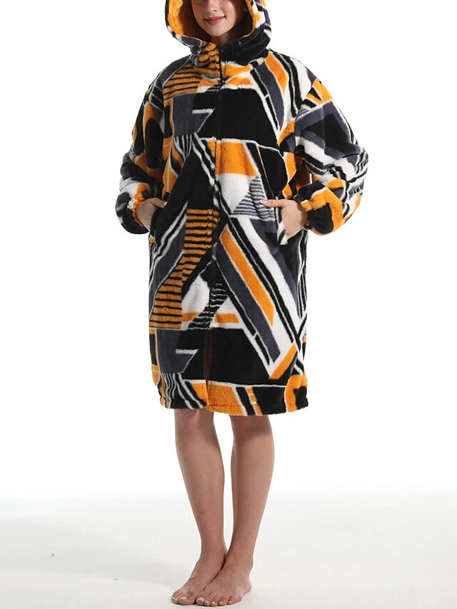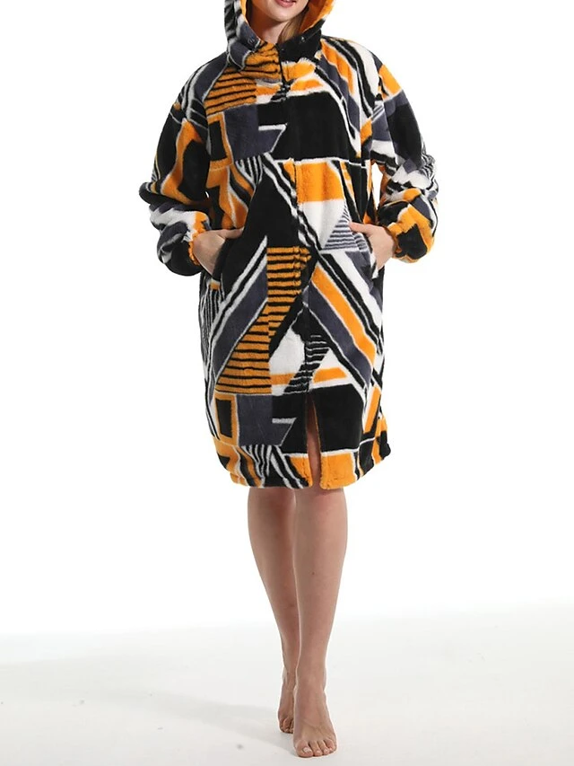 Women’s Robe Geometic Plush Casual Comfort Home Daily Bed Flannel Warm Breathable Hoodie Long Sleeve Pocket Fall Winter Orange