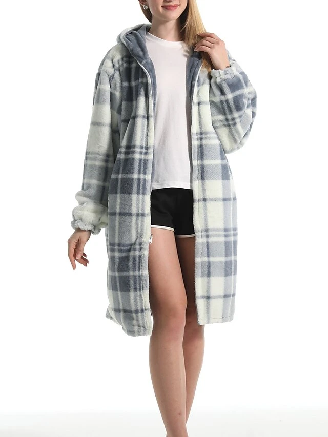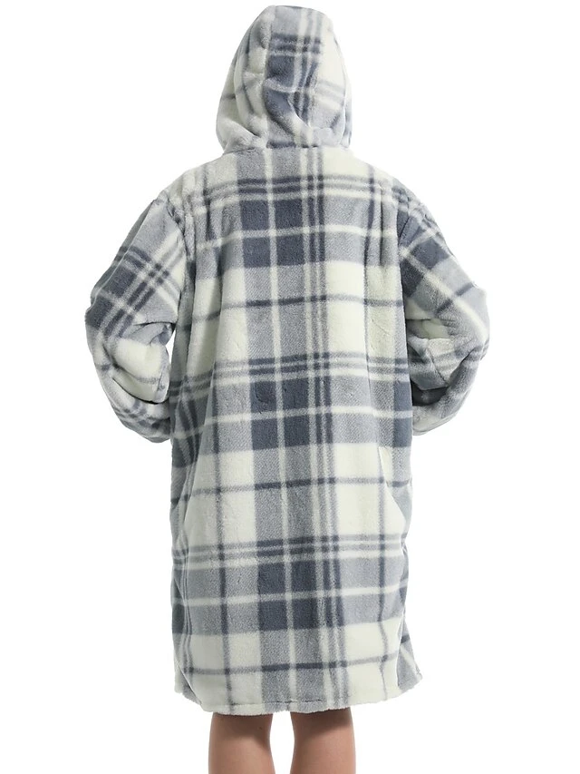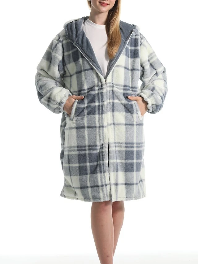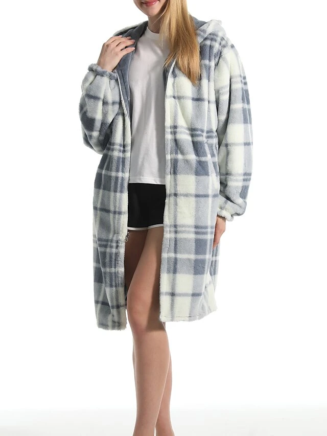 Women’s Robe Grid / Plaid Plush Casual Comfort Home Daily Bed Flannel Warm Breathable Hoodie Long Sleeve Pocket Fall Winter Gray