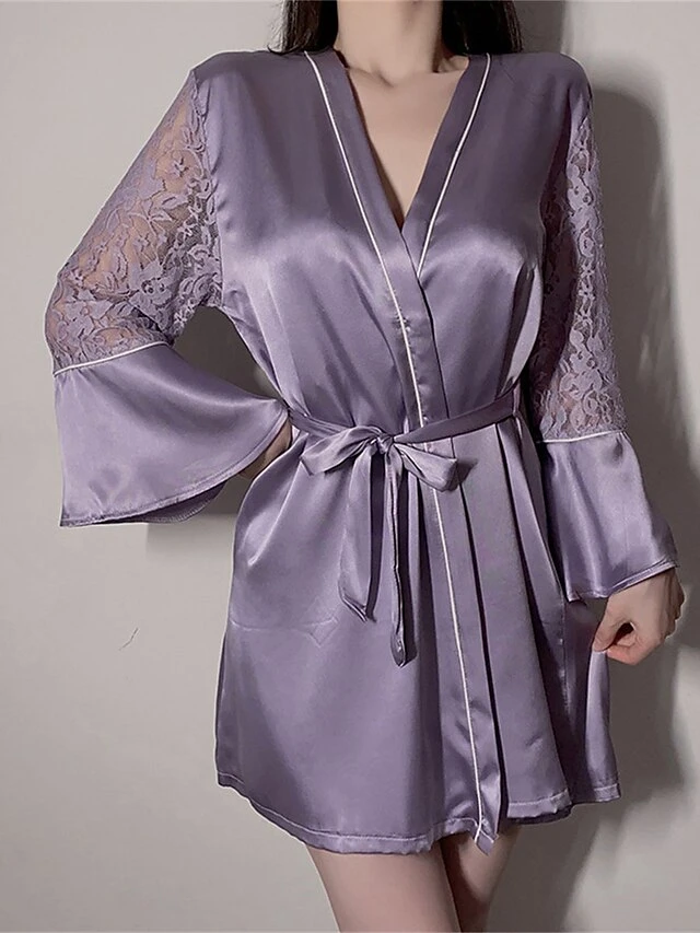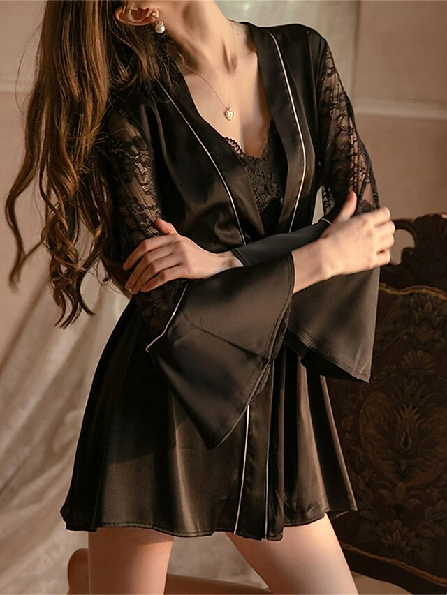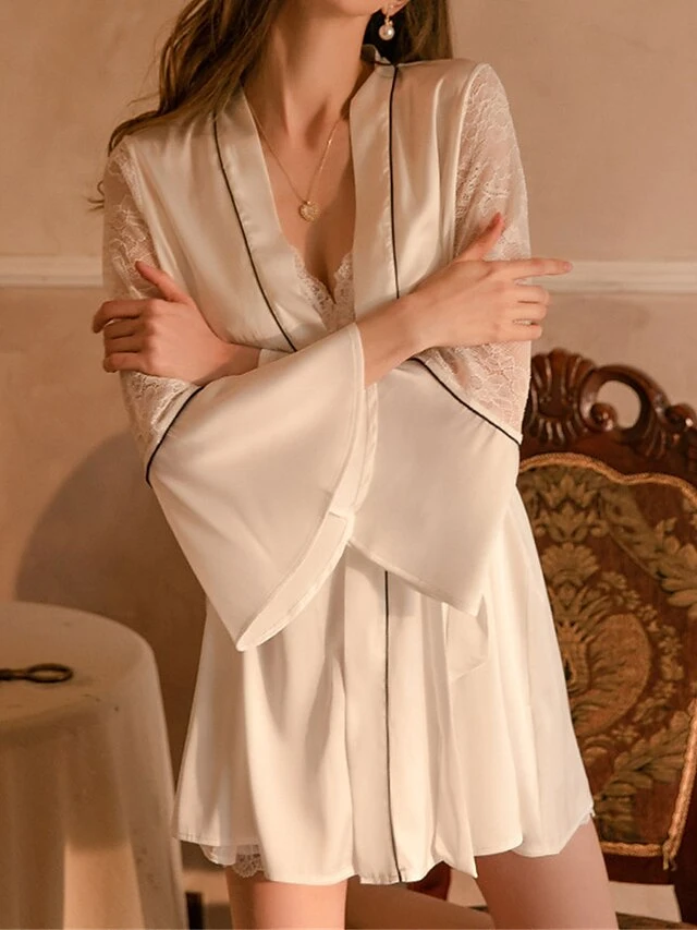 Women’s Satin Silk Bathrobe Nightgown Nightshirt Dress 2 Pieces Pure Color Comfort Soft Sweet Home Daily Bed Breathable V Wire Long Sleeve Backless Hole Fall Winter Black White