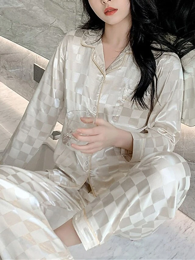 Women’s Satin Silk Lounge Sets 2 Pieces Grid / Plaid Fashion Casual Comfort Street Daily Date Silk Breathable Lapel Long Sleeve Pant Button Pocket Summer Fall Black White