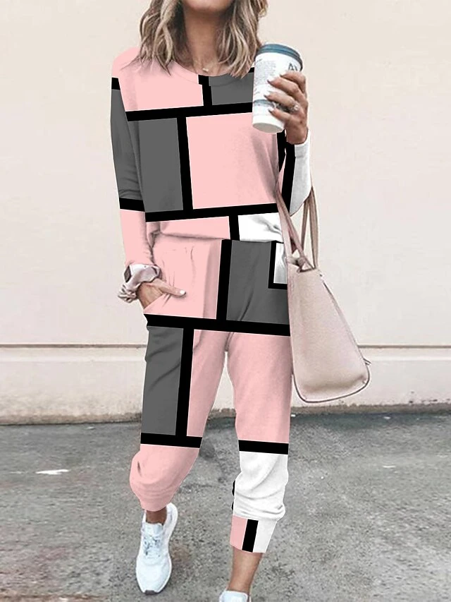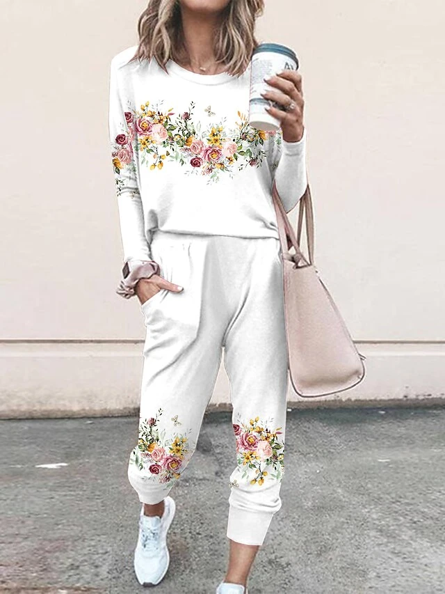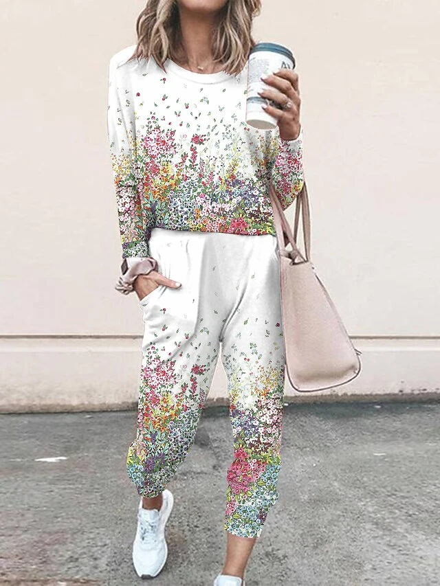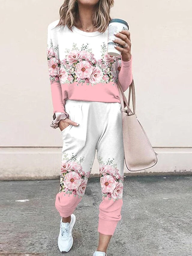 Women’s Sets 2 Pieces Geometic Flower Casual Comfort Home Daily Polyester Breathable Crew Neck Long Sleeve Pullover Pant Pocket Fall Winter Light Pink White