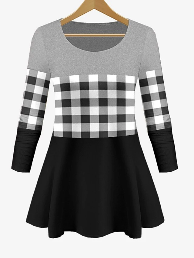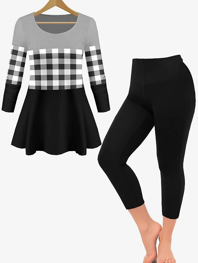 Women’s Sets 2 Pieces Grid / Plaid Casual Comfort Home Daily Polyester Breathable Crew Neck Long Sleeve Pullover Pant Summer Spring Black