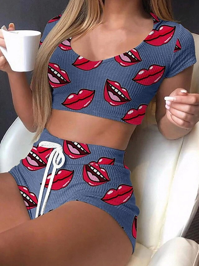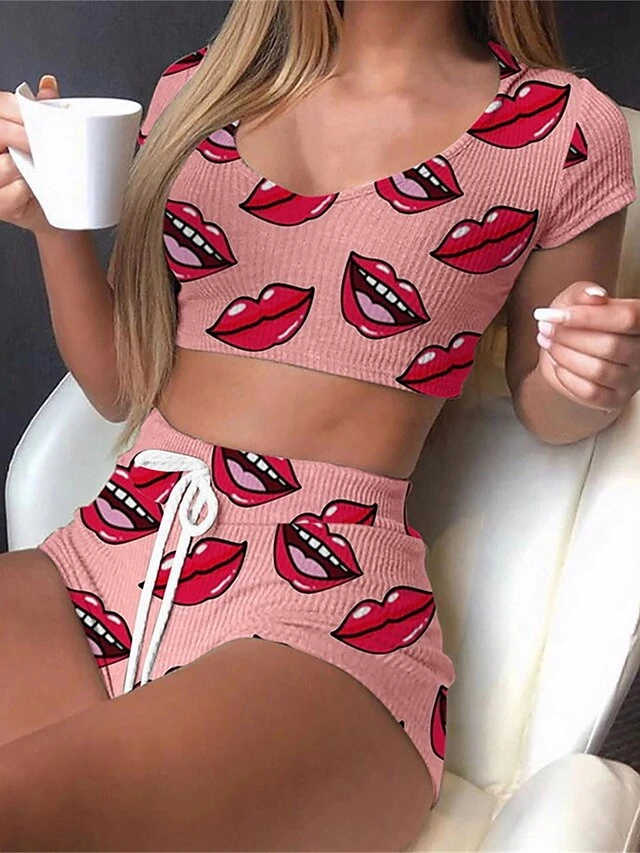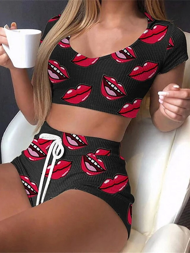 Women’s Sexy Lingerie Sets Lip Lovers Hot Comfort Home Daily Bed Polyester Breathable Crew Neck Short Sleeve Crop Top Shorts Summer Spring Black White