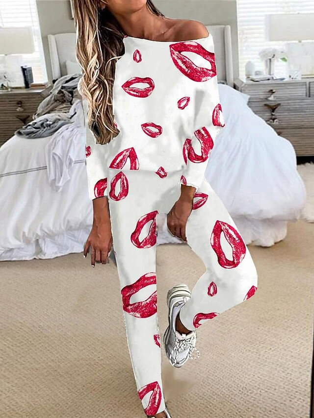 Women’s Sweatsuit Lip Pattern Lounge Sets Heart Abstract Sport Comfort Home Street Vacation Polyester Crew Neck Long Pant Pullover Fall Winter White Red