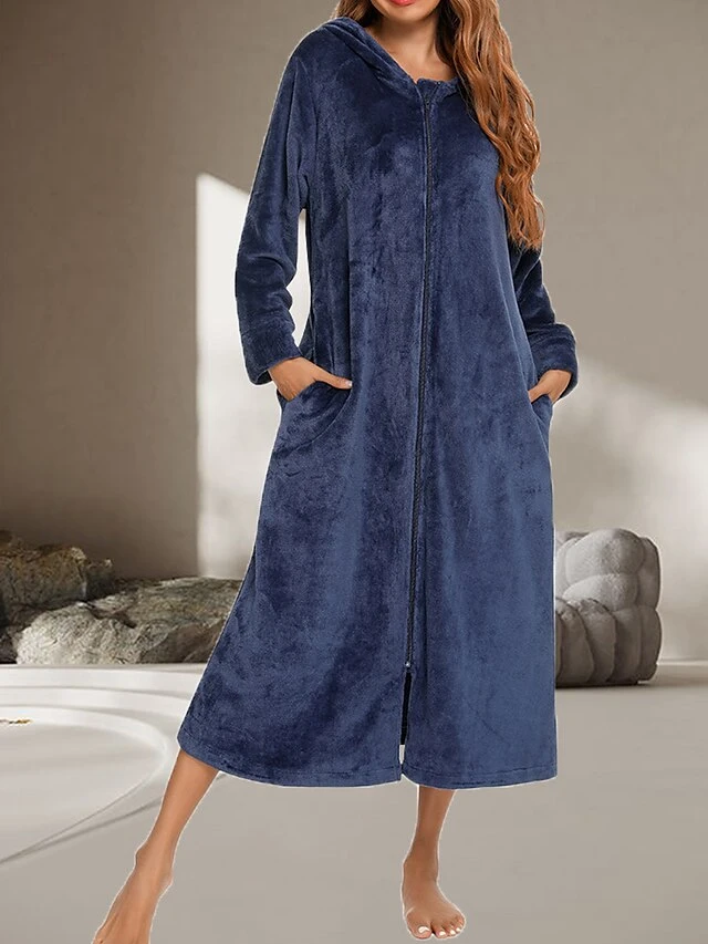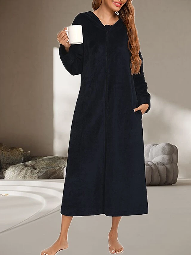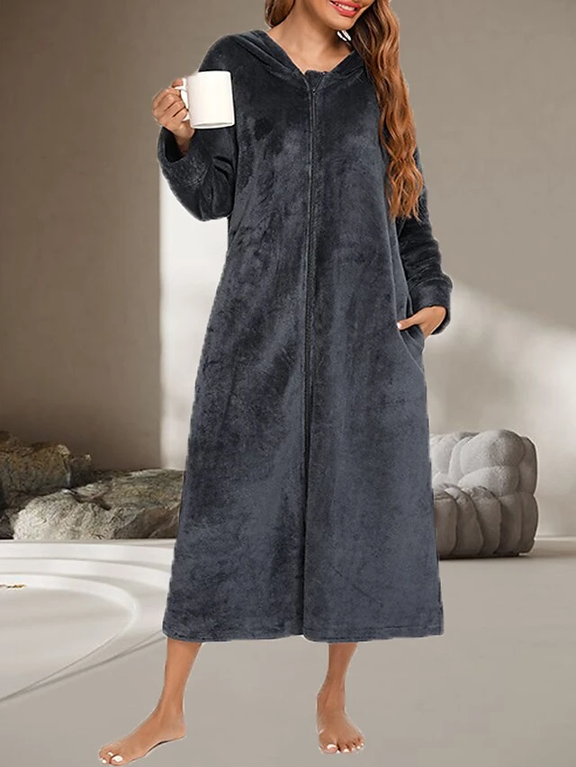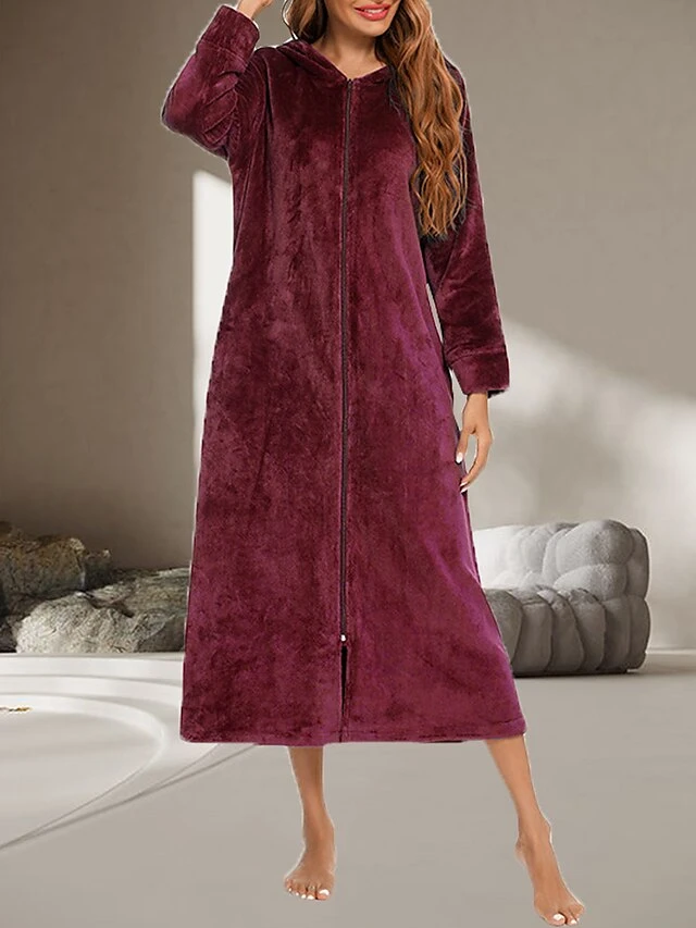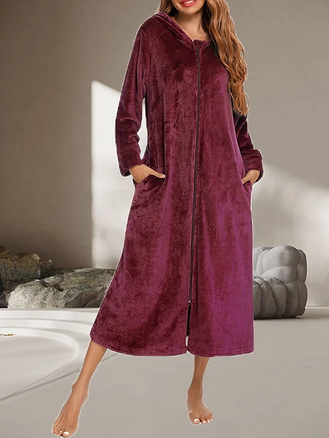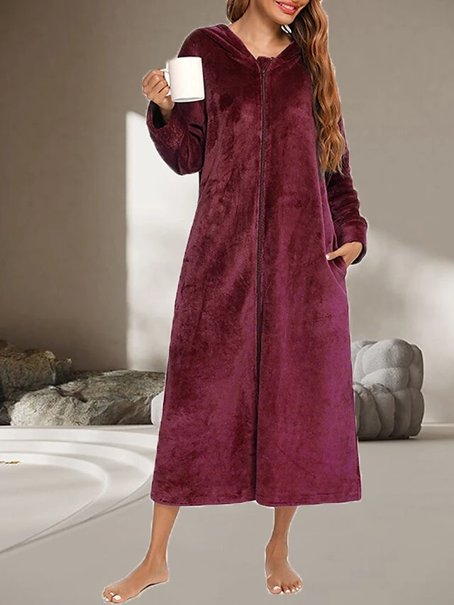 Women’s Warm Bathrobe Robes Gown Pure Color Simple Casual Comfort Home Daily Bed Polyester Breathable Hoodie Long Sleeve Pocket Fall Winter Black Wine