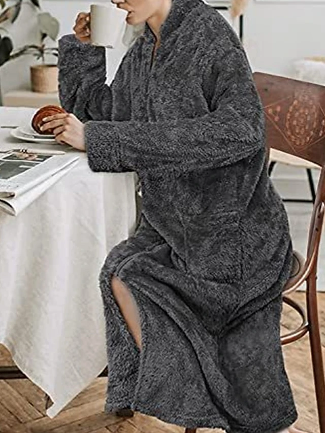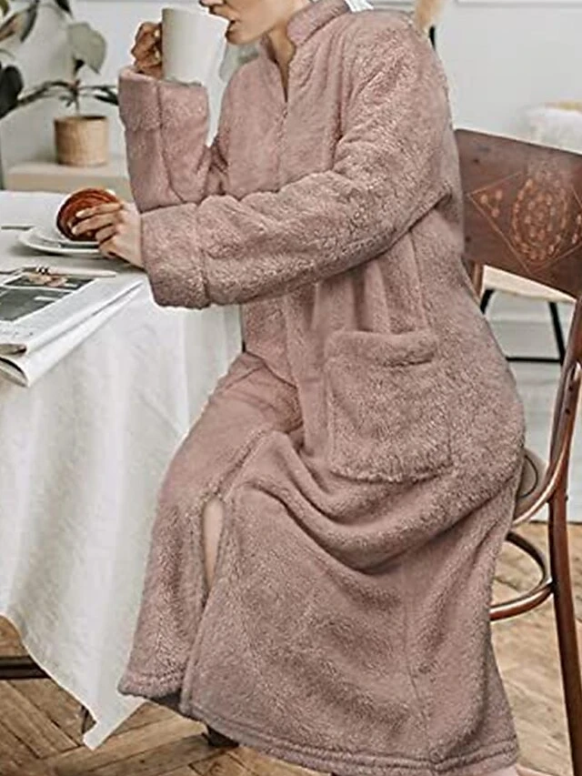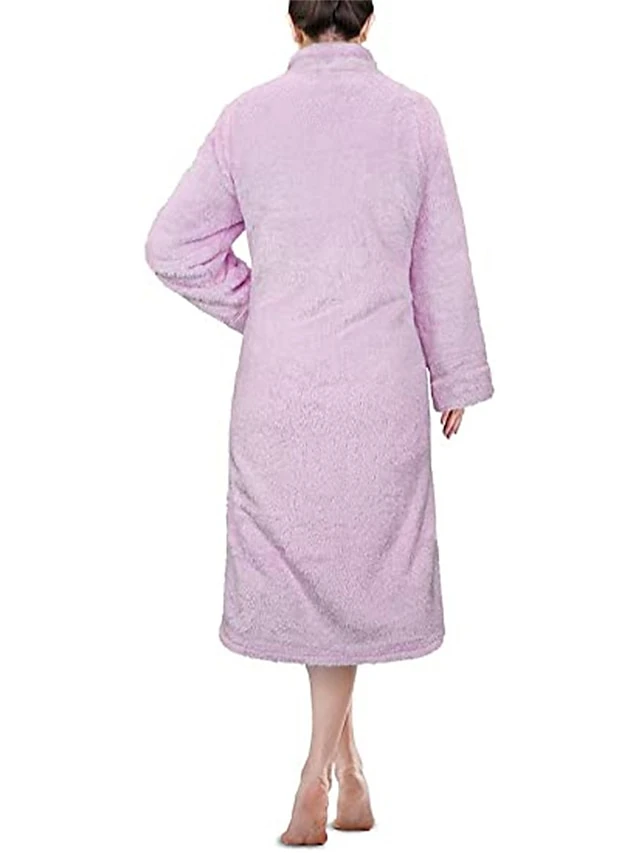 Women’s Zip Up Front Robe Bathrobe Wearable Blanket Pure Color Warm Plush Casual Home Daily Bed Flannel Warm Breathable Stand Collar Long Sleeve Pocket Fall Winter Black Pink